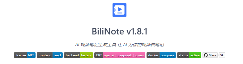 BiliNote 是一个开源的 AI 视频笔记助手,支持通过哔哩哔哩、YouTube、抖音等视频链接,自动提取内容并生成结构清晰、重点明确的 Markdown 格式笔记。支持插入截图、原片跳转等功能。